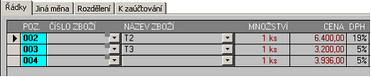 Údaje na řádku faktury, které můžete vyplňovat jsou: pozice, objednací číslo, název zboží, množství, mj, cena , dph, nákupní cena a potvrzení dodání. Ostatní údaje jsou jednak převzaty z ceníku a jednak vypočteny (např.: cena celkem, typ zboží).