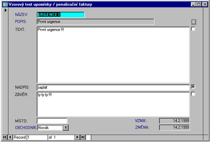 Vzorová upomínka představuje textový vzor, který bude použit pro tisk hromadných upomínek, nebo pro tisk penalizačních faktur. Konkrétní upomínka bude obsahovat adresu dlužníka i seznam dlužných částek. Při vyplňování vzorového dopisu musí uživatel tento vzor pojmenovat a případně zadat popis daného vzoru. (např. UPO1, první upomínka ve 3 týdnech po splatnosti). Podle těchto informací bude uživatel volit vzor, ale tyto informace nebudou použity pro tisk. Pro tisk jsou připraveny tři bloky textu. Úvodní, uvozující a závěrečný. Uživatel předplní i jméno obchodníka a místo odkud jsou upomínky odeslány. Text v uvedených 3 blocích není nijak omezen velikostí a u každého bloku je logický přepínač pro volbu, zda bude tisk proveden v tučném nebo normálním písmu.